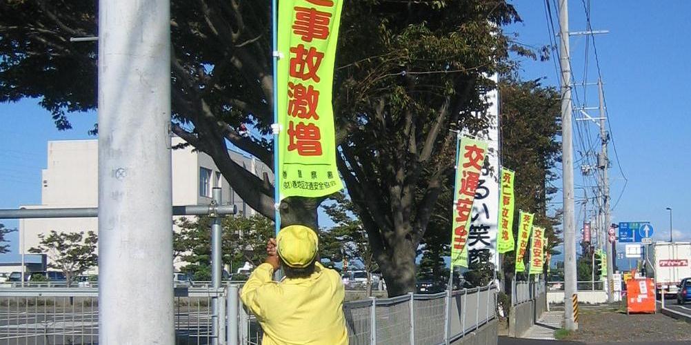 交通安全運動期間中や交通事故が多発した時など、道路脇に「交通安全」のぼり旗を掲出し、歩行者や運転者に安全運転の意識向上を促しています。