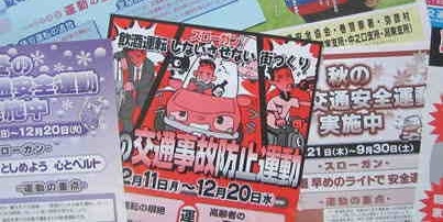 交通安全運動期間中に事故防止広報のチラシを作成し、全戸配布や回覧、街頭指導所等で配布し事故防止を呼びかけています。